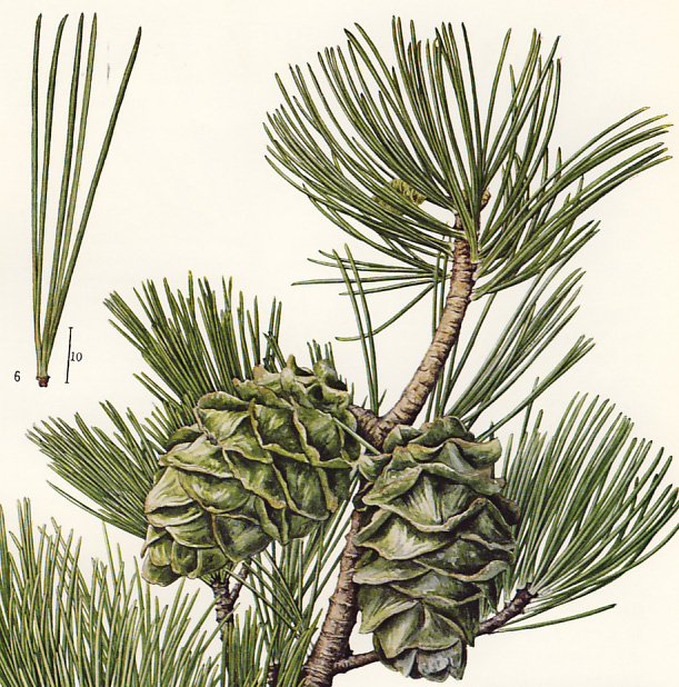 Leaves are 5 in a fascicle on short spurs, triangular in a cross section, deep green on dorsal surface, pale greenish white with 2 stomatal bands on ventural surface.