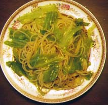 トウガラシ1本と、3,4切れに薄切りにした1かけらのニンニクを、たっぷり(60cc)の良質のオリーブ油でニンニクがきつね色になるまで炒める。
