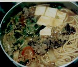 次にキムチ200g程度を鍋に入れ、ほぼ煮えたら、味噌一玉を溶き、ミリンを少々入れ、最後にとうふを加える。(2、3人前)