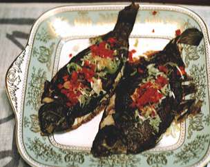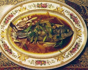 2 中華なべに油大さじ3〜4を熱し、魚を入れ、なべを回しながら、両面をゆっくりこげ色がつく位にほど良く焼き、次のものをかけて食べる。