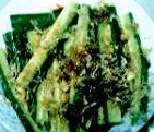 ニンニク1片をすり下ろし、醤油小さじ3、ごま油小さじ1、味の素少々を加えたタレをかけ、カツオ節をまぶして食べる。