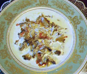 舞茸とベーコンをこんがりと炒め、炒めたニンニクを少し加え、生クリームをかけて食べる。これは、スパゲッテイのソースにもよい。