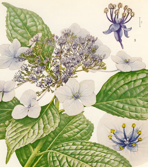 Flowers open in June to July on new shoots. Sterile flowers are pale purplish or nearly white.