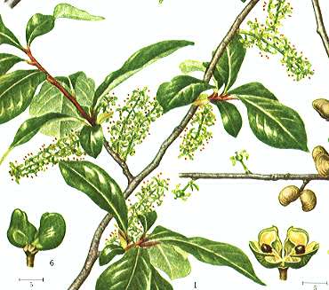 Greenish flowers open in April to May on the branchlets of the previous year.