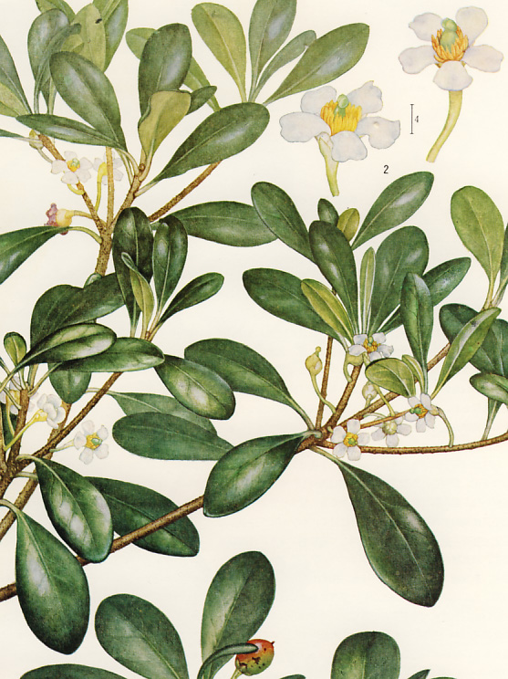 Leaves are alternate, thick coriaceous, entire on the margin, rounded at the apex, deepgreen and lustrous above, yellowish green beneath.