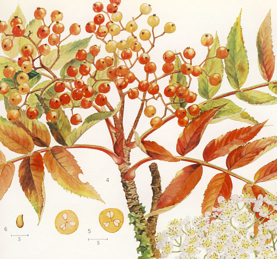 Leaves are alternate, odd-pinnate, glaucous beneath. In autumn leaves turn to red beautifully.