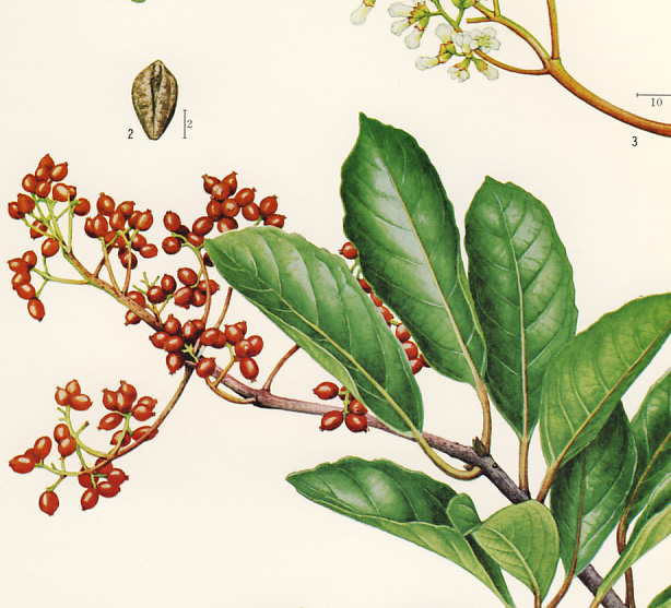 Leaves are decussately opposite, thick coriaceous, deep green and lustrous above.