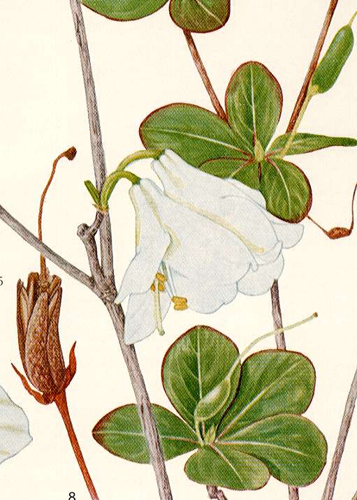 Leaves are clustered 5 togather at the end of shoots, obovate, membranous, rotundate at the apex, entire but often margined with red purple cilium.