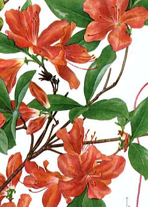 Bright red flowers open in April to May with leaves.
