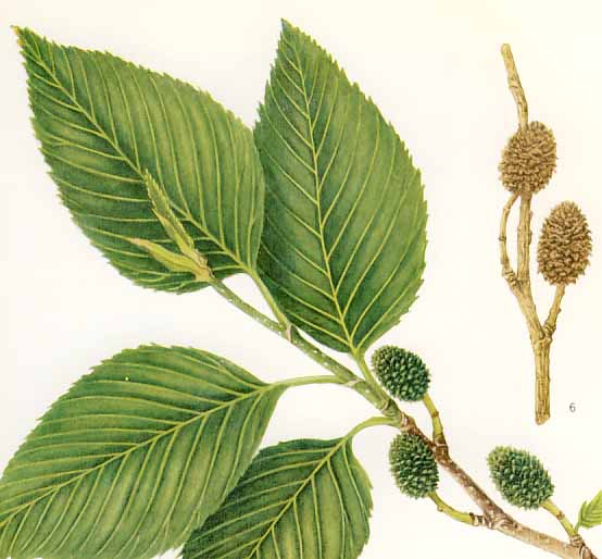 Leaves are alternate, unequal at the base, serrulate on the margin.