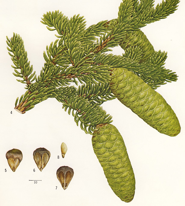 Cones 6-10 cm long ripen yellowish green to brownish in September.