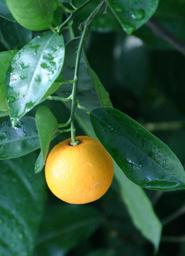 ミカン科Rutaceae ミカン属 英名、Sweet orange 中国名、甜橙 常緑小高木。 葉は、楕円状披針形。。 果は、球形で黄色に熟す。生食する。 ネーブルオレンジの原種。 中国南部原産。